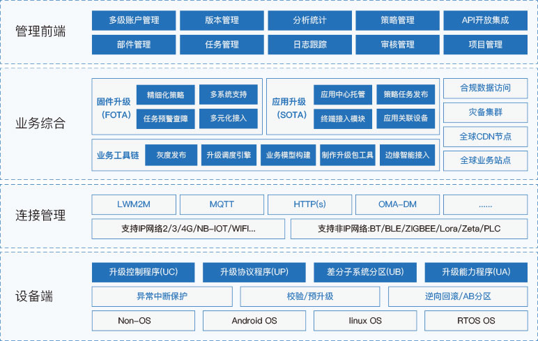 艾拉比物联网OTA提供的是一整套完整的体系解决方案。艾拉比OTA在设备端和云端均有成熟的解决方案和丰富的平台适配经验。云端艾拉比提供的管理平台,满足客户对用户管理、版...